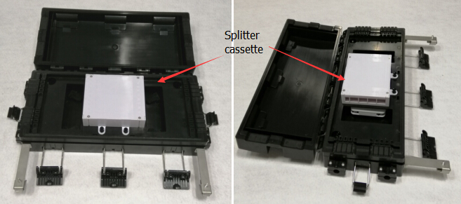 OTB-P039 is a plastic outdoor aerial hanged mounted fiber optic terminal box. It has two layer space. The upper space load a plastic splitter cassette that load PLC steel tube type splitter 1:2, 1:4, 1:8, 1:16; also it support 16 drop cable output.