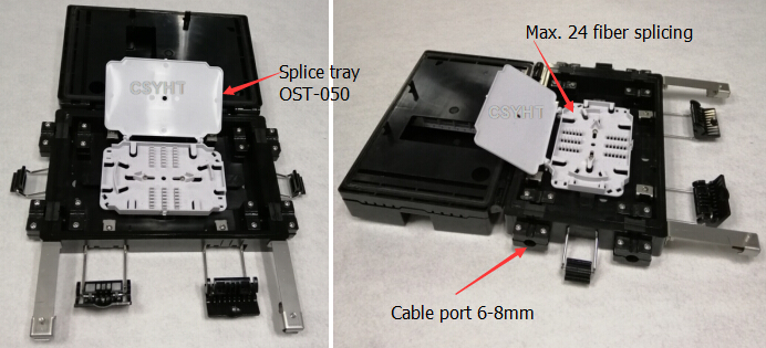 The lower space load 1pc fiber optic splice tray OST-050 support max. 24 fibers splicing and connection. It has 4 cable port 6-8mm.