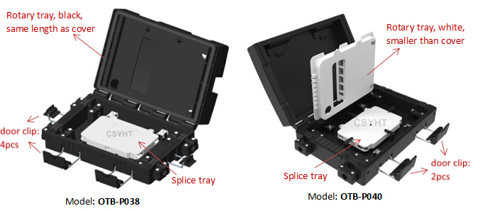 OTB-P040 is a plastic outdoor aerial hanged mounted fiber optic terminal box. It has two layer space. The upper space load a plastic splitter cassette that load PLC steel tube type splitter 1:2, 1:4, 1:8.
