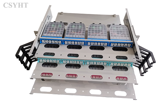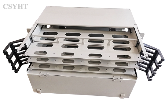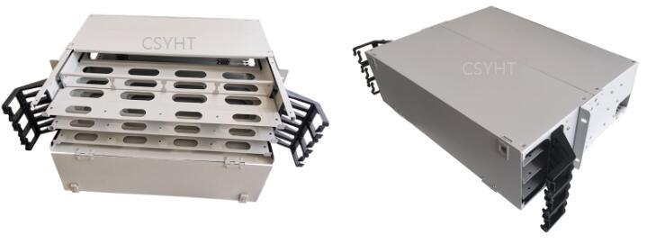 It is sliding type 3U height for 19inch rack mounted application. It has 3 sliding trays, each sliding tray is with 4 MPO cassettes. It load 12pcs MPO cassettes HD-07 for max. 288 fibers connection and distribution. There are cable fixing kit at back side of patch panel and with cable management rings at front side of patch panel. It has front and rear metal doors.
