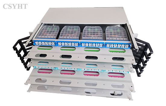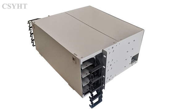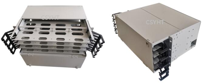 It is sliding type 4U height for 19inch rack mounted application. It has 4 sliding trays, each sliding tray is with 4 MPO cassettes. It load 16pcs MPO cassettes HD-07 for max. 384 fibers connection and distribution. There are cable fixing kit at back side of patch panel and with cable management rings at front side of patch panel. It has front and rear metal doors.