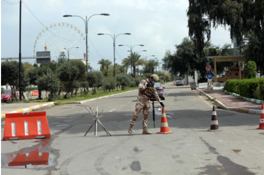 3月18日,在伊拉克巴格達,一名伊拉克安全人員走在空蕩的街頭。新華社發