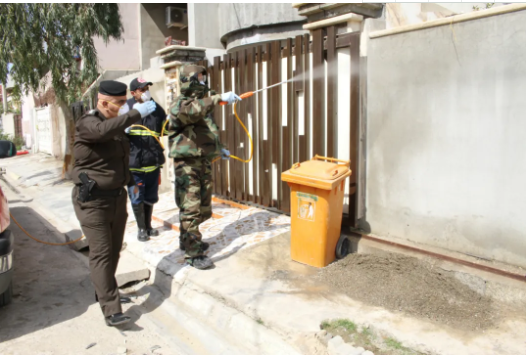3月8日,在伊拉克北部基爾庫克省,醫療人員為新冠肺炎確診病例所在家庭的房屋消毒。新華社發