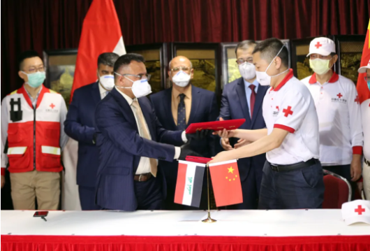 3月16日,在伊拉克巴格達,中國專家組領隊與巴格達醫學城代表交接證書。新華社發