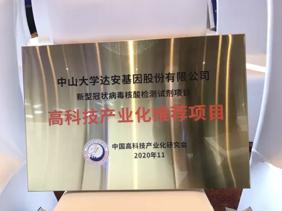 中山大學達安基因股份有限公司根據《高科技產業化推薦項目申報、評選辦法》的有關要求,及時提交了“新型冠狀病毒核酸檢測試劑項目”的項目申報書。由相關專業的院士、專家、企業家組成的評選委員會通過對申報材料進行謹慎且專業的審查、評議,并由中高會理事長會批準并公示后,本項目最終獲得由中高會頒發的“高科技產業化推薦項目”稱號及牌匾。