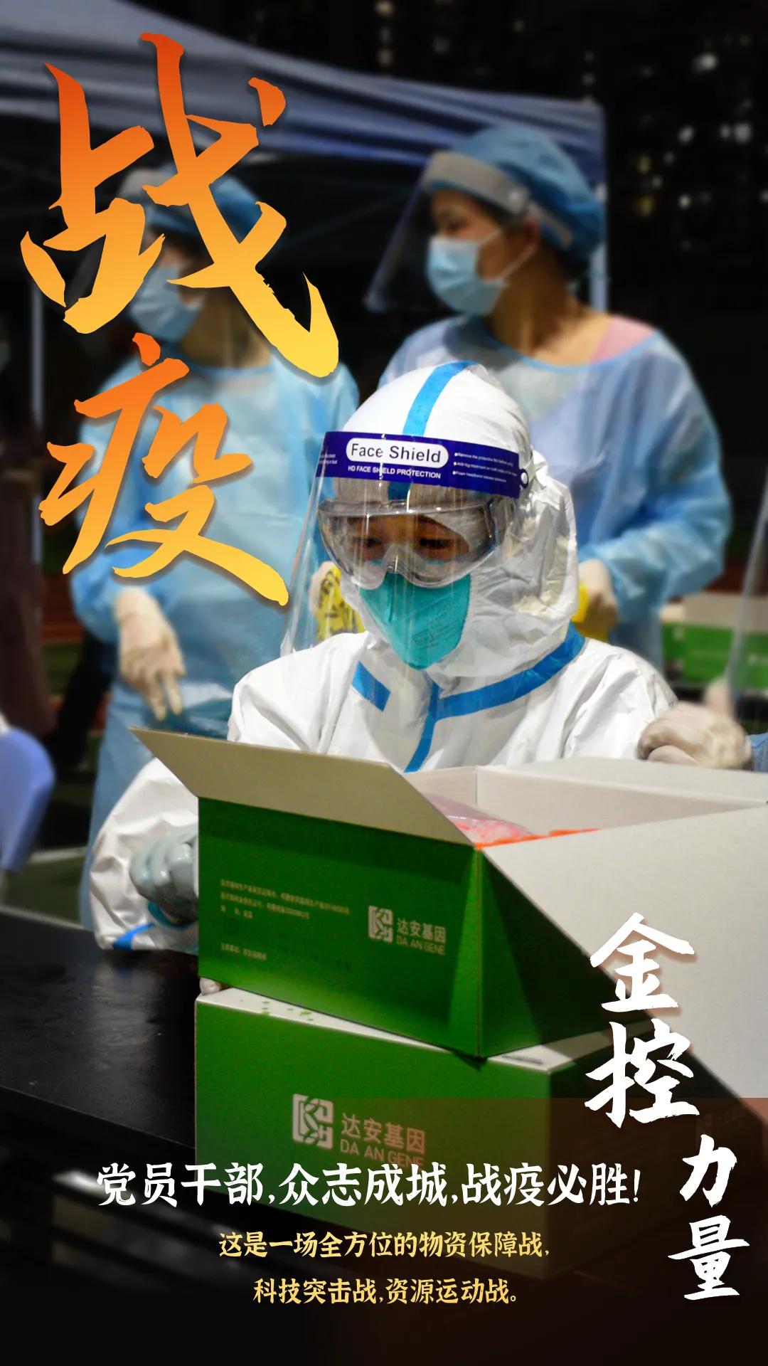 在他們背后,站著一支強大的后援隊,“廣金先鋒”黨員突擊隊和廣州金控黨員干部志愿隊。 疫情防疫戰,是一場全方位的人力組織戰、物資保障戰、科技突擊戰、資源運動戰。廣州金控集團全力支持和協助達安基因做好防疫物資的生產和供應。 集團上下,各部門單位,堅決服從集團黨委的統一指揮、統一協調、統一調度,強化與政府職能部門溝通協調機制,支持達安基因把主要精力放在檢測現場,形成全集團打贏疫情防控阻擊戰的強大合力。 眾志成城,共克時艱,戰疫必勝!